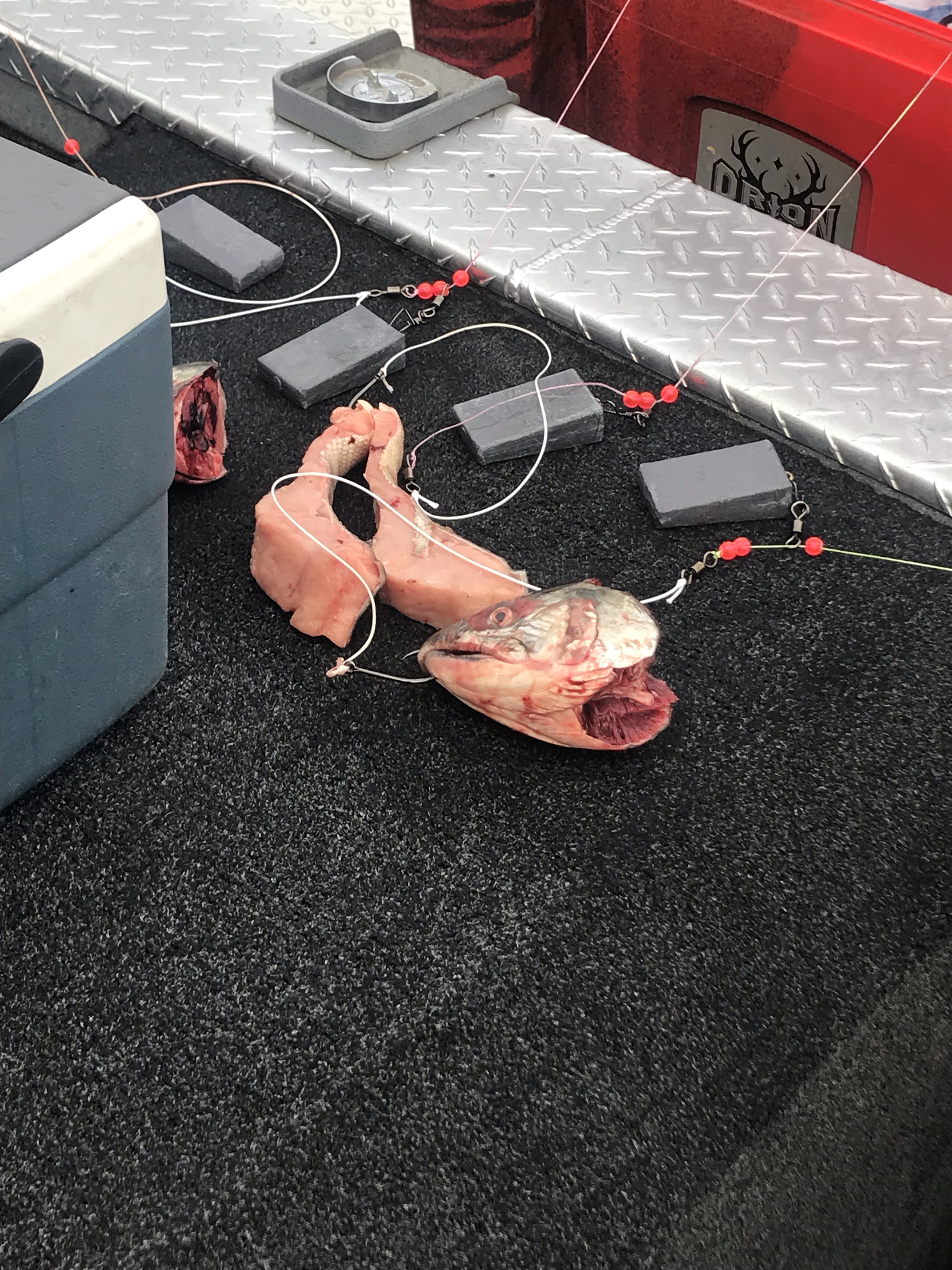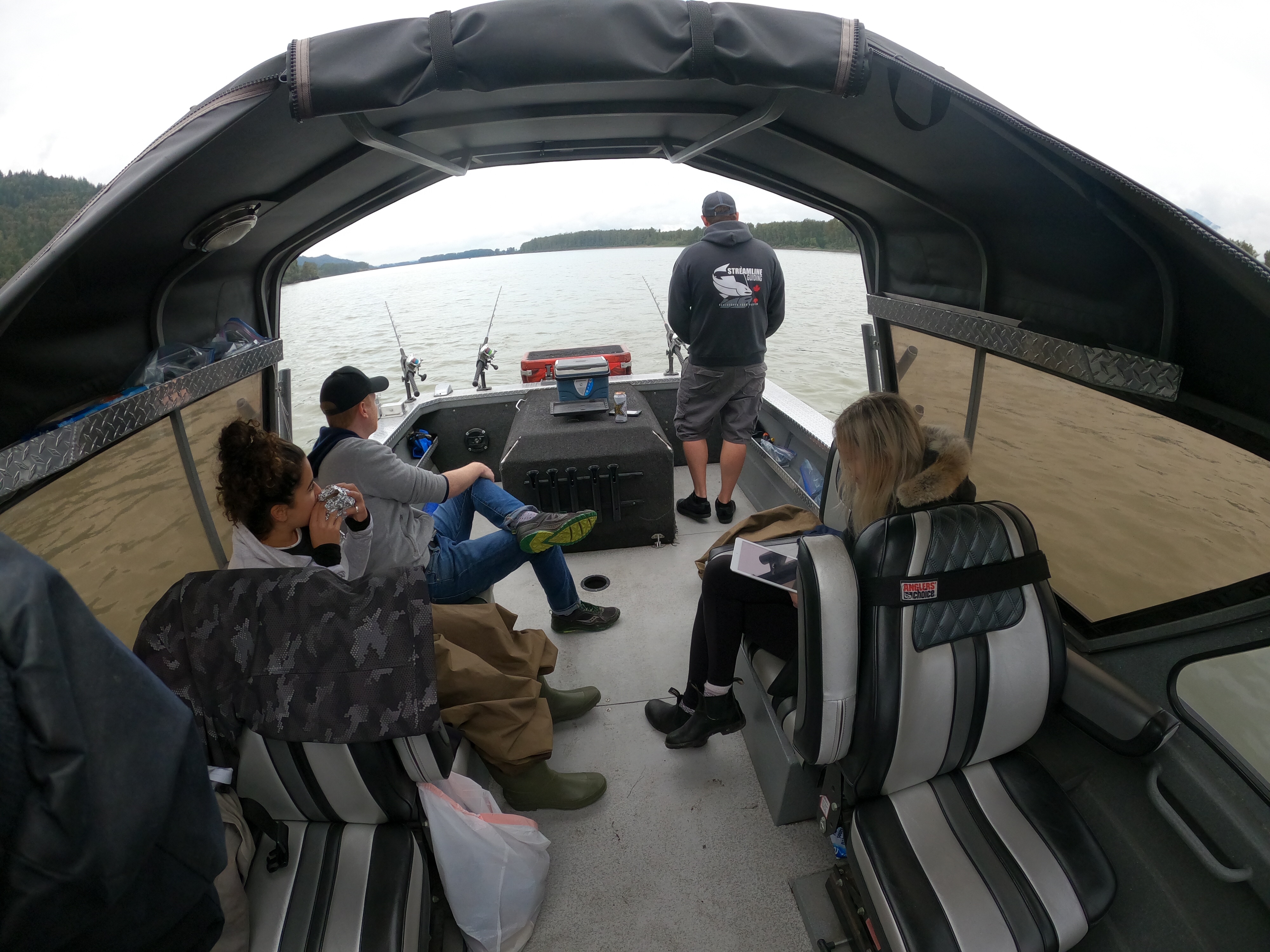 We didn’t go far before anchoring amongst some other boats at our first fishing spot. Braeden talked us through the process and technique while he set up the rods. We would fish with 4 rods, all with slightly different bait. Mostly chum salmon, a head or a fillet and one line with salmon roe. Braeden took the bait very seriously, not only did he catch fresh salmon the evening before, he also wore gloves when touching the bait, hooks and weight. Sturgeon are basically blind but have an excellent sense of smell so it attention to detail is required.