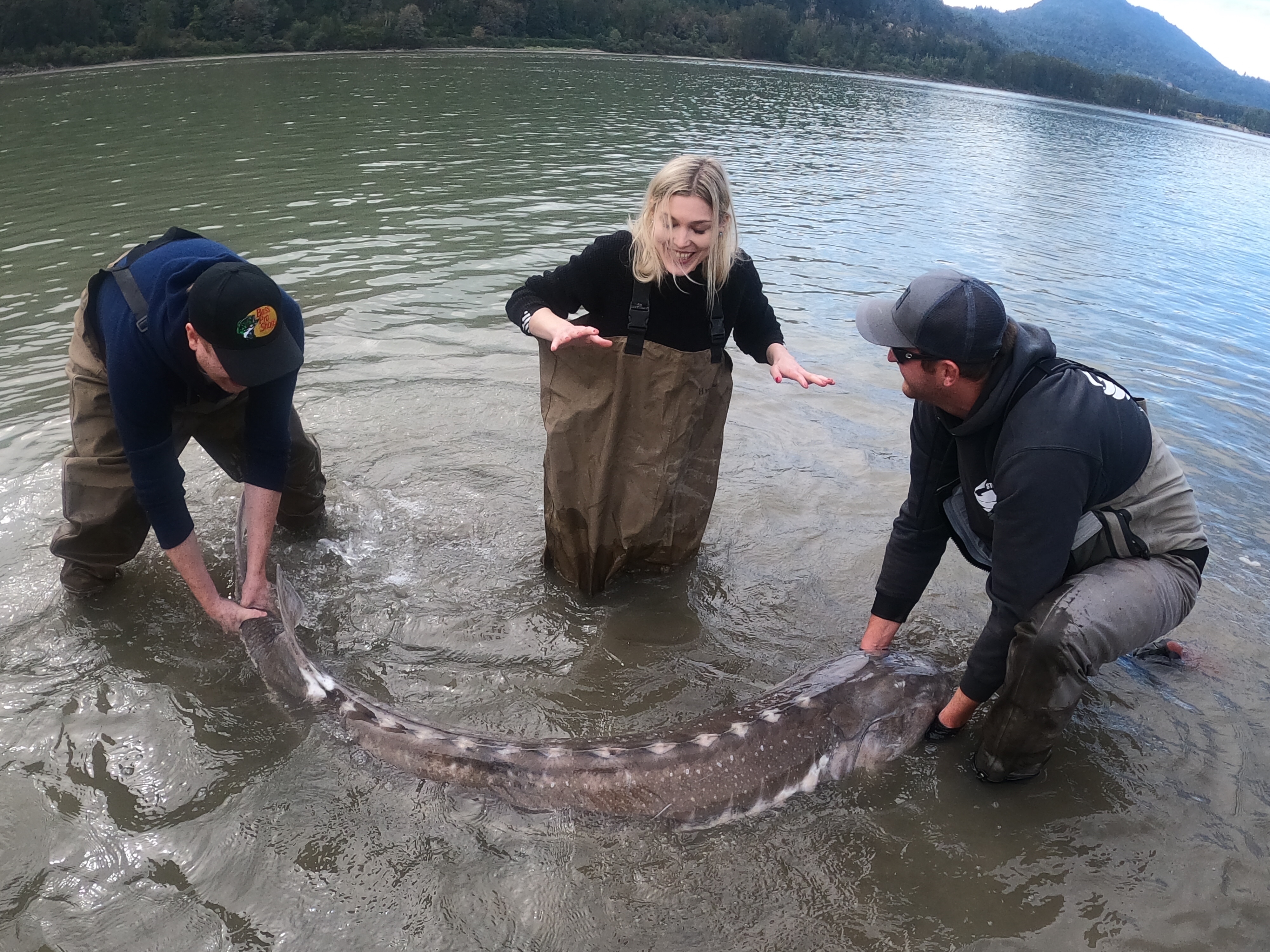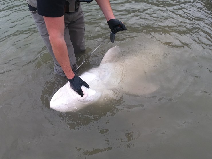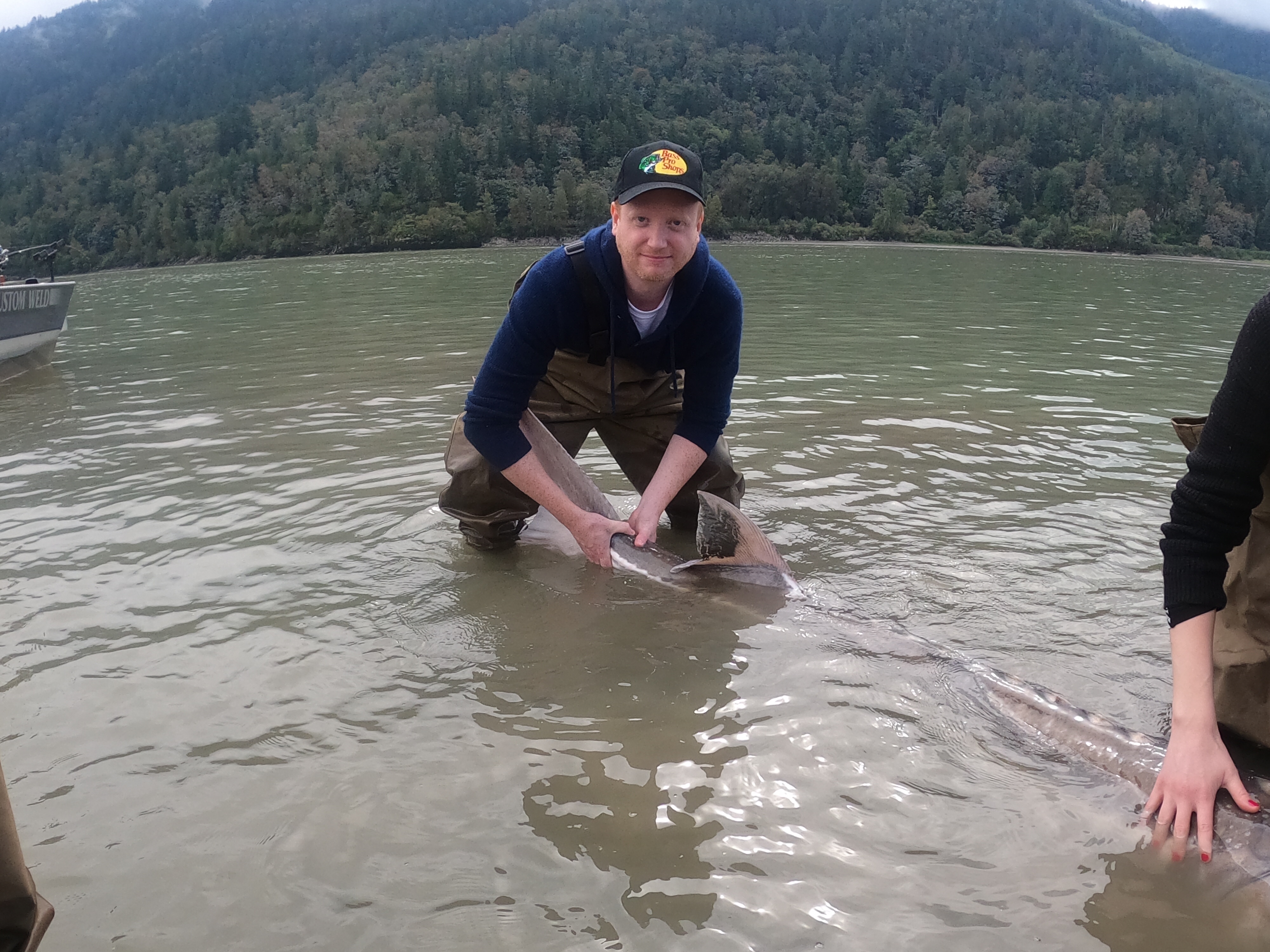 We finally arrived in the shallows and Braeden and I got in to get it set up for the photo. You hold them by their mouths which are soft (no teeth) but also very tough. I took told of it in while Braeden measured it. It started to wriggle and when a sturgeon wriggles it is quite something. I felt like my hand was being crushed in its mouth while also being thrown around but I was not letting go.