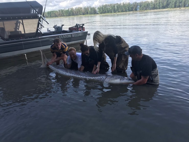 The team was completed by our girlfriends, Lauren and Kimia, who were both coming on their first fishing expedition. What a way to start, chasing dinosaurs! Sturgeon were around during the Triassic period, 240m years ago. Most are 5-9ft but the big ones are 10-12ft and the world record is 24ft.
