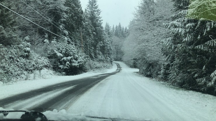 I was correct. However, at Sechelt we turned away from the town and headed North. Still following the Google lady’s instructions we drove in to the woods. Eventually we were told to turn up a steep hill. This was concerning as the forecast had snow and ice and we were in a Prius. This would make the return downhill terrifying and any subsequent uphills impossible.