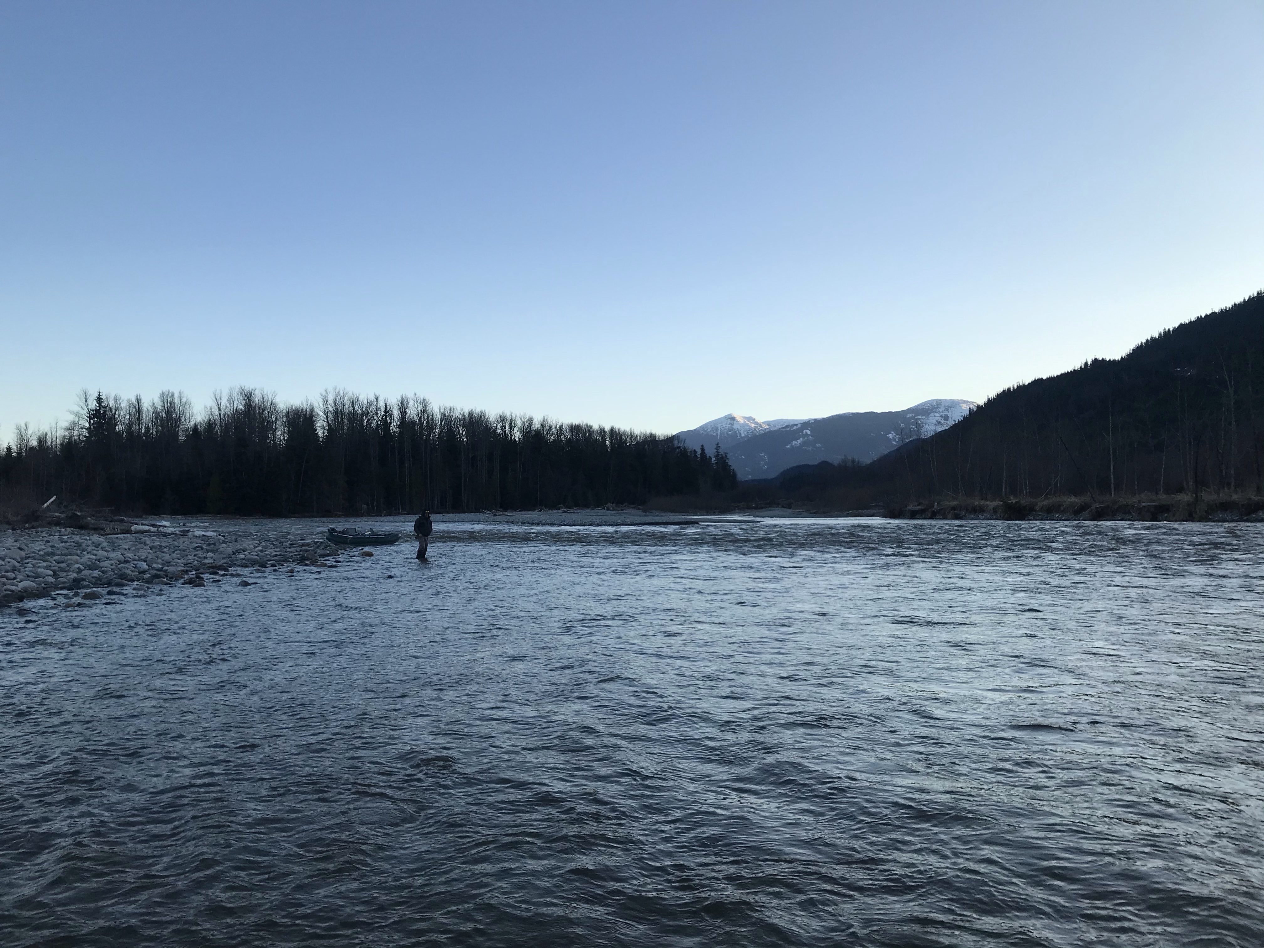 We returned to the Kalum as it was the only river with any visibility. We wanted the first choice of pool so agreed on an earlier start, 5am. We might have gone a little early as had to wait for it to get light at the boat launch but we got our spot, Deep Creek Pool. The key spot. At the launch the colour didn’t look promising but as the sun rose it was actually clearer than expected and probably the best visibility of the trip.