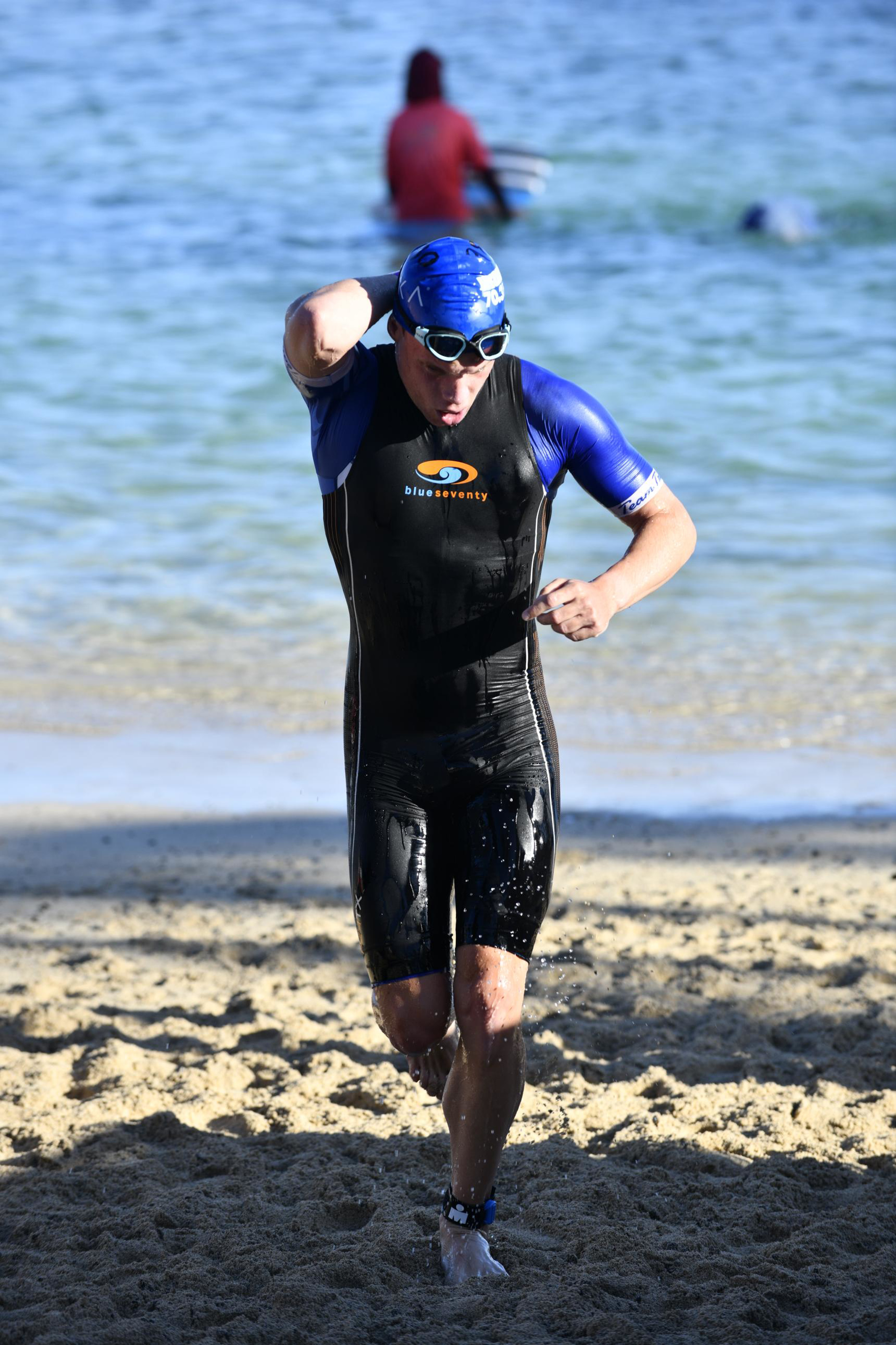 There really wasn’t much to report as I swam alone and paced it pretty much perfectly for my swim fitness. The only challenge was the long leg back was directly in to the sun and I couldn’t see anything. I took the approach that if I followed the other swimmers, who I could just about see, I would be ok. After the race I spoke to a number of people and not one had been able to see but had taken the same strategy. The blind leading the blind but it worked out in the end.