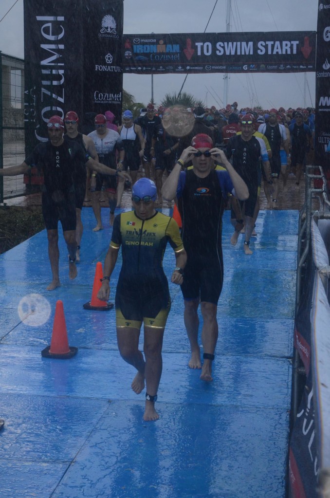 I ran to the shuttles as 1hr 50 swimmers were being called. I was stressed but through the chaos I managed to get myself to the front of a queue and a seat on a bus. On disembarking we emerged into a full monsoon, I was soaked through in seconds. I dropped my prerace bag and walked the 5 minutes to the start.