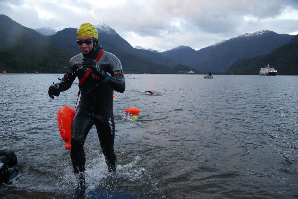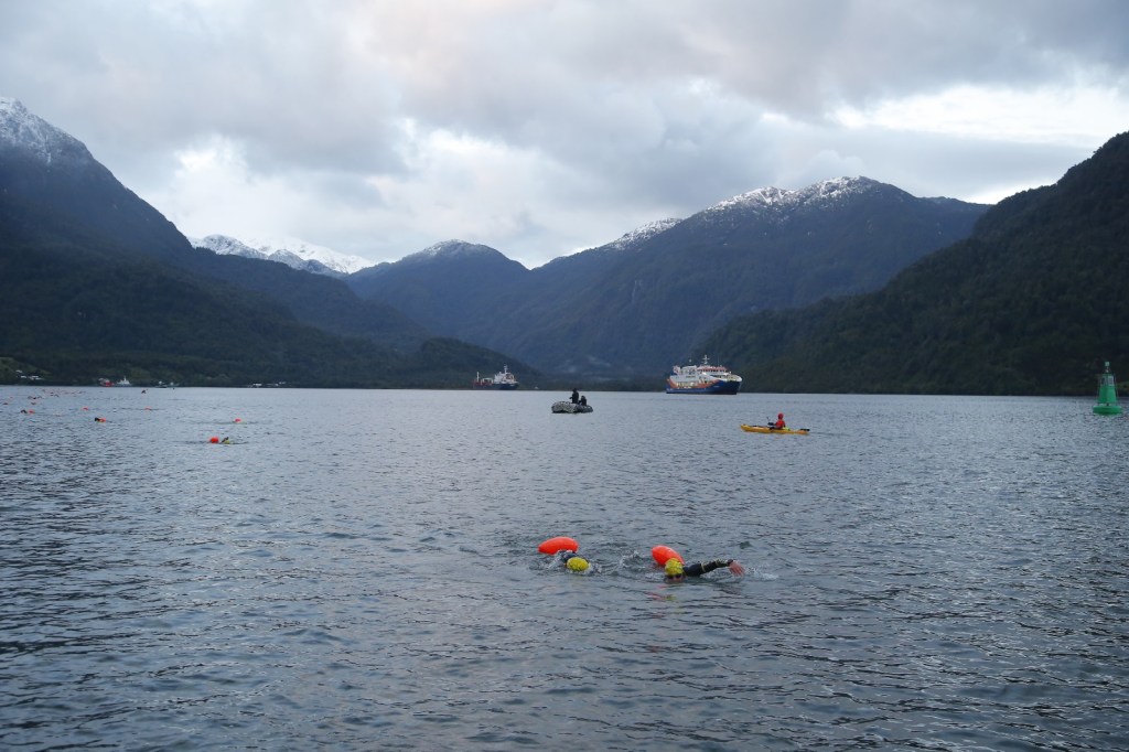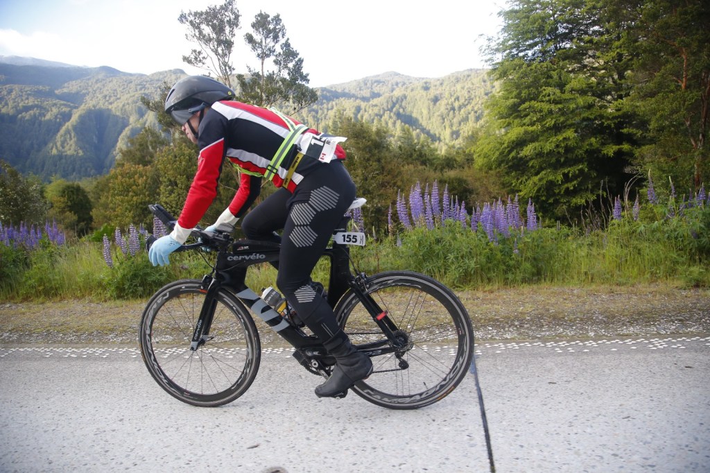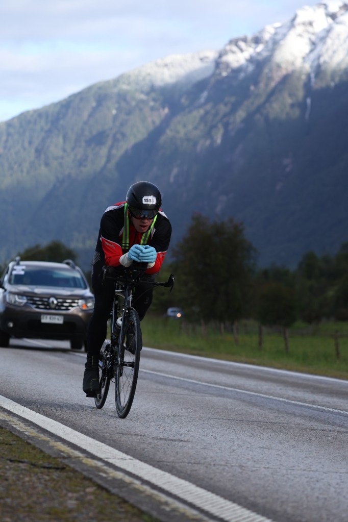 Patagonman is a point-to-point ironman distance race – cold water (10-13 degrees) sea swim – 3.8k, cycle 177k – 2700m elevation and gravel sections, 43k trail run – 1000m elevation. It is held in Patagonia, Chile, a seriously remote part of the world. Entries are limited to 300, of which only about 165 make it to the start line. You are required to provide your own supporter who helps you as the race is self supported. Their roles include: warming you up and helping you change in transition; nutrition and support on the bike; meet you at 30k into the run; and finally carry you home at the end.