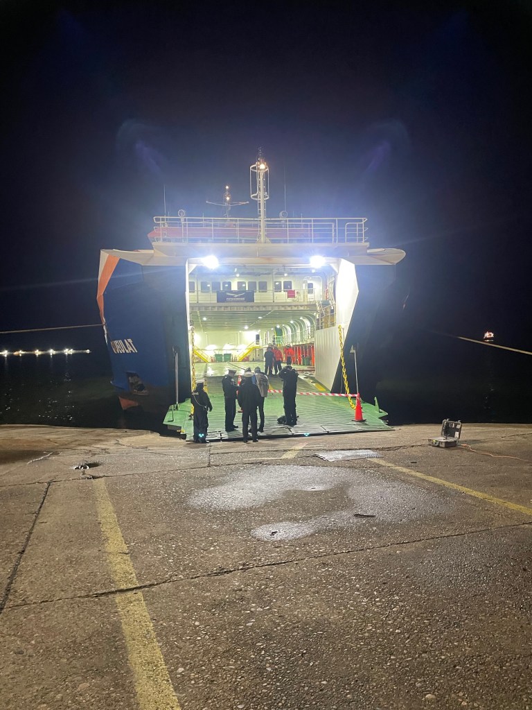 What is allowed and became a problem was actual cold feet. The air temp was 3/4 and the metal of the ferry underfoot, even in boots, was really cold. There wasn’t anywhere to stay warm, and it became a case of huddle together like penguins. I kept moving around as I could feel the nerves and was trying to stay warm. At one point we were dragged out of the slight shelter/warmth of the engine room to lie down for a photo which I didn’t really appreciate.