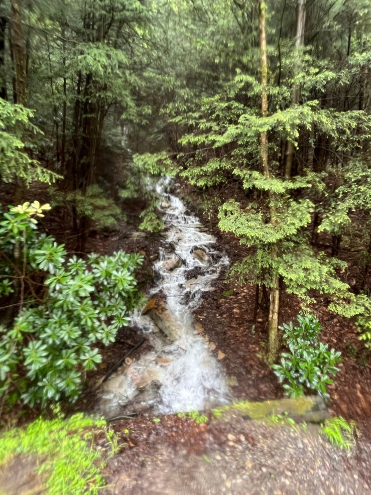 By now we were just getting wetter (if possible) and muddier as the trail was throwing up a lot of dirty water. Morale continued to deteriorate and we couldn’t even find a covered place to stop for a snack. When we did stop, not covered, my bagel and muffin hadn’t survived the rain and were very soggy!