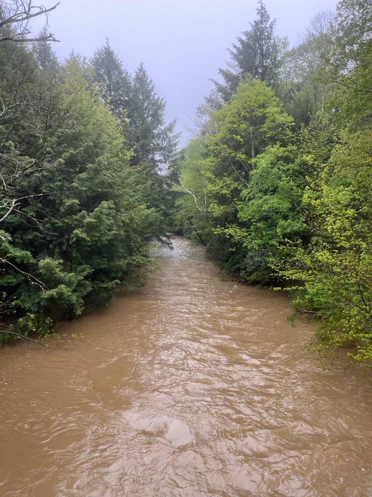 We woke to a gray but not raining morning and after breakfast got moving. The river was still running hard but had come down a bit since last night. The day before it had gone up 10 feet in 12 hrs which is pretty insane.