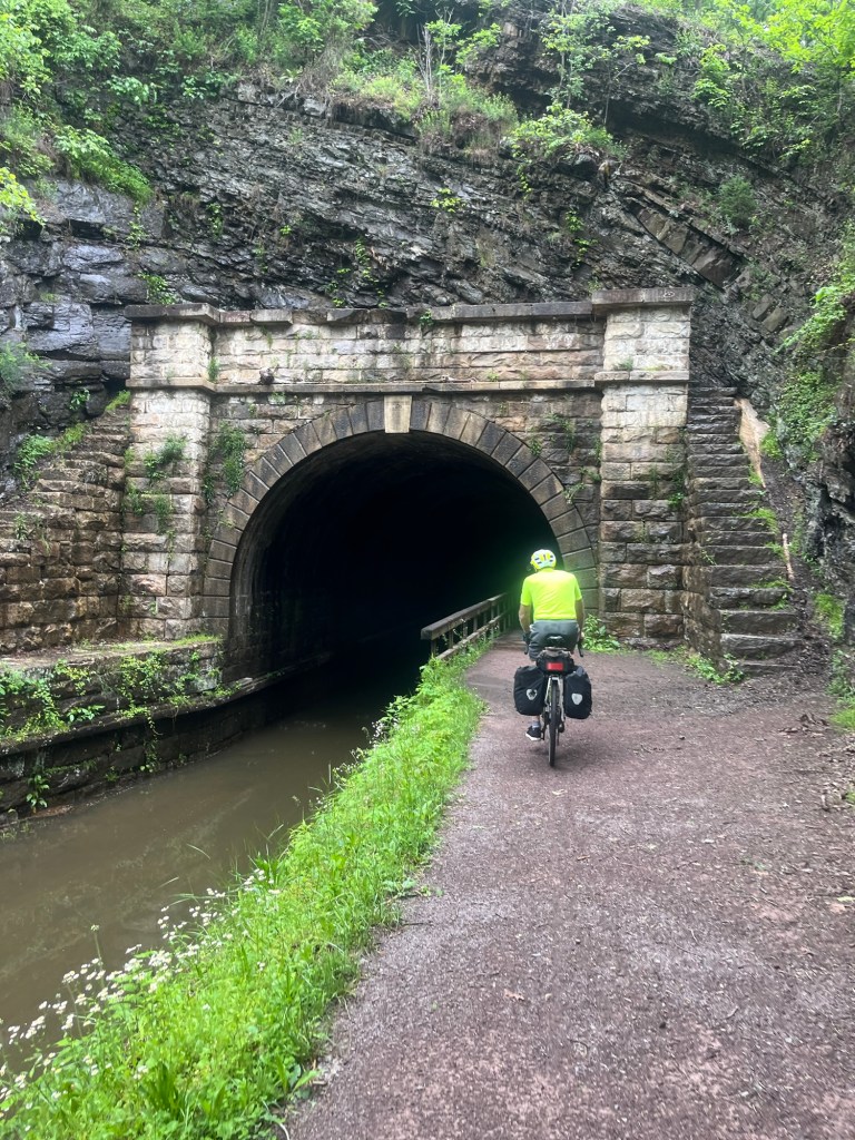We tried to rejoin the trail at Paw Paw and luckily this was possible as there were no signs. The first thing we had to do was go through the Paw Paw tunnel which is quite a cool tunnel. However the narrow path was uneven, had puddles and no light. So common sense prevailed (Rob) and we walked our bikes through.