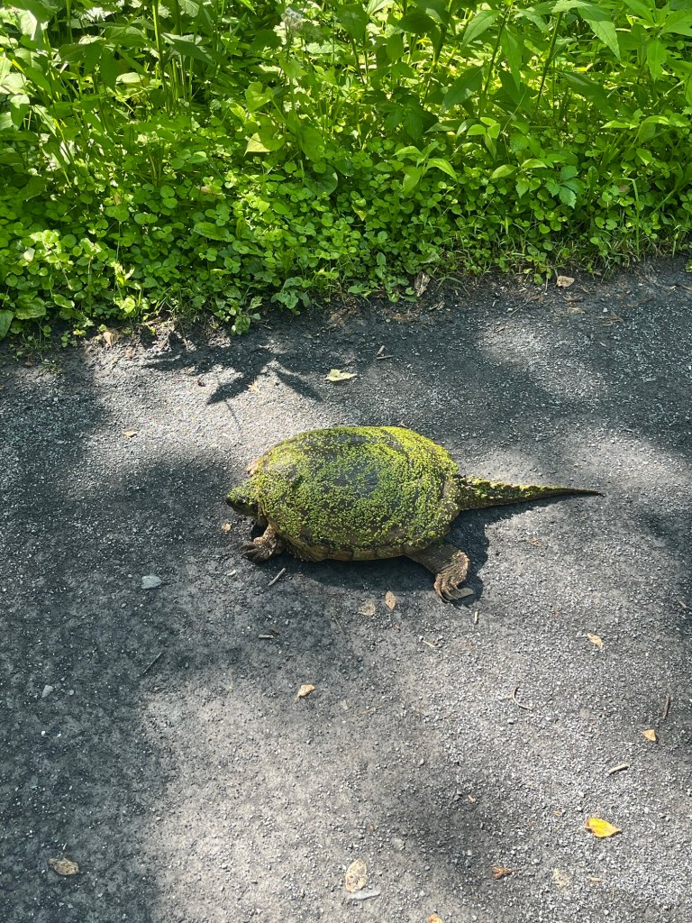 The trail took us down to Brunswick where we had to dodge the fallen trees, washed out trail and muddy patches which made it slow progress but we made it. Highlights were encountering a giant terrapin on the trail and seeing a heron standing on a log drifting down the river. The downside was if you stop the bugs find you in no time and I took a few nibbles!