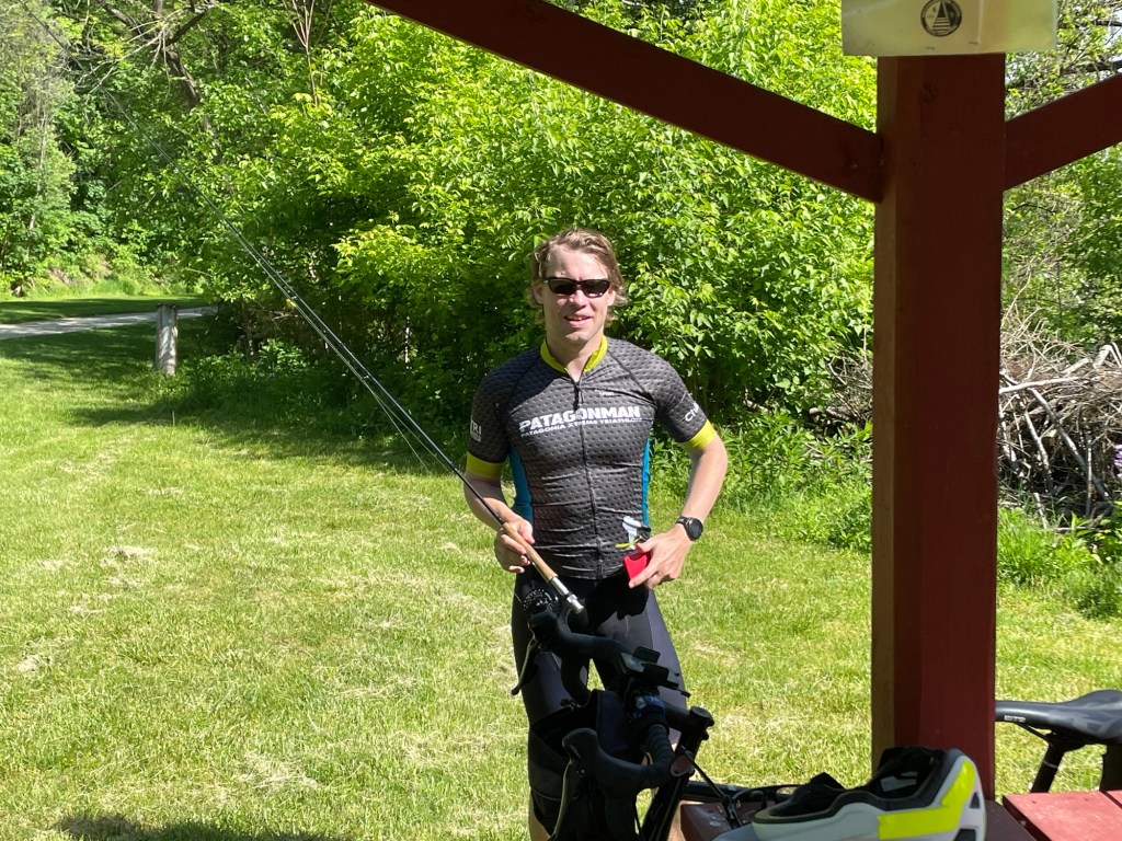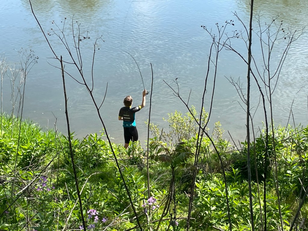 We came into town and our hotel, the Comfort Inn, is perfectly placed next to the trail close to the start of the town. As a bonus it was right by the river and lots of people were fishing. After a quick shower I headed out for some wet wading to see if i could have some success. I had a nibble and the guy next to me caught two. So I was getting closer. The sun was getting pretty strong though so I retreated inside for a rest. A long few days ahead and didn’t need to over do it on day 1.